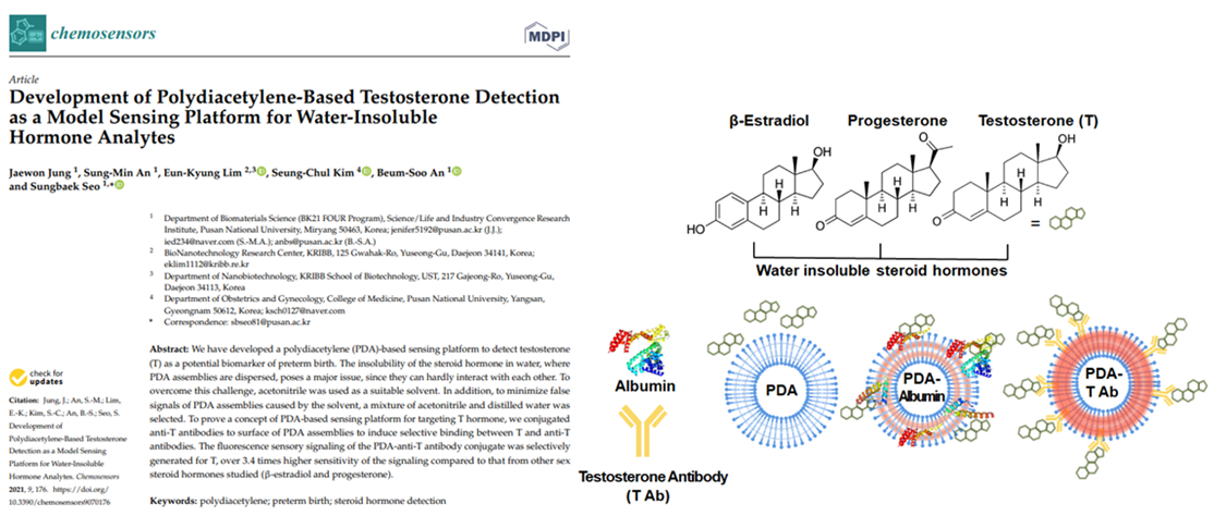 서성백 교수연구팀은 조산의 바이오마커가 될 수 있는 스테로이드 호르몬 중 테스토스테론을 감지하기 위한 고분자입자 기반 센서를 개발했습니다. 테스토스테론의 물에 대한 불용성 한계를 극복하고 호르몬 특이적인 센싱을 할 수 있었습니다.